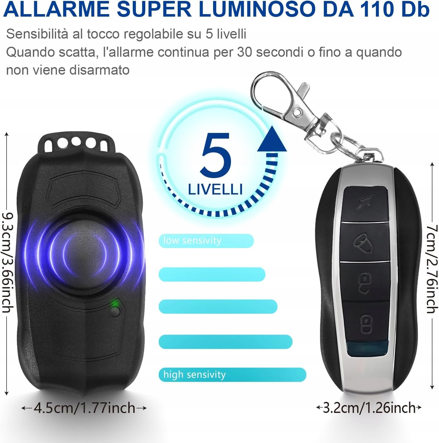 - ?5 regulowanych poziomów czułości i alarm awaryjny SOS ? 5 poziomów czułości można regulować od delikatnego dotyku do naciśnięcia lub uderzenia, które można łatwo ustawić w zależności od potrzeb. Ten alarm rowerowy jest również wyposażony w funkcję alarmu awaryjnego SOS. Może to zabrzmieć jak SOS, aby przypomnieć innym, aby pomogli im w razie wypadku. Włącz: przycisk alarmu (naciśnij 3 sekundy)